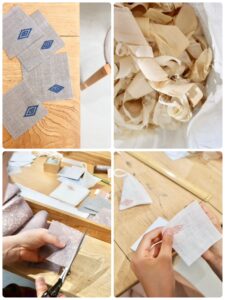 宮司さんから神明宮のこと、真っ黒焦げでも内側には焼けていない木が眠っていること、そのカンナで削った部分がとても良いヒバの香りがすること、神職の装束のこと、そこに使われる有職模様のお話などを色々伺い、役目を終えた「狩衣」を再利用して燃え残ったありがたいヒバの「香り袋」を作る事になりました。
